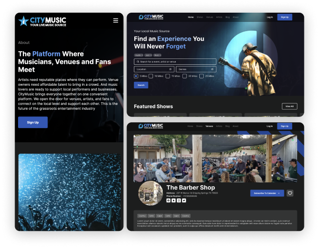 City Music had to be more than just an informational website telling a story and pitching a service. It needed to include search functions with criteria such as artist names, locations, music genres, and more while also handling sign-up forms custom-tailored for artists, venue owners, and fans. Our team relied on market research and our own expertise to determine which pages should be designed for individual client groups and which ones could provide information that spoke to all three types of visitors. Our goal was to craft a well-organized website that served multiple purposes while still speaking directly to visitors with distinct needs.