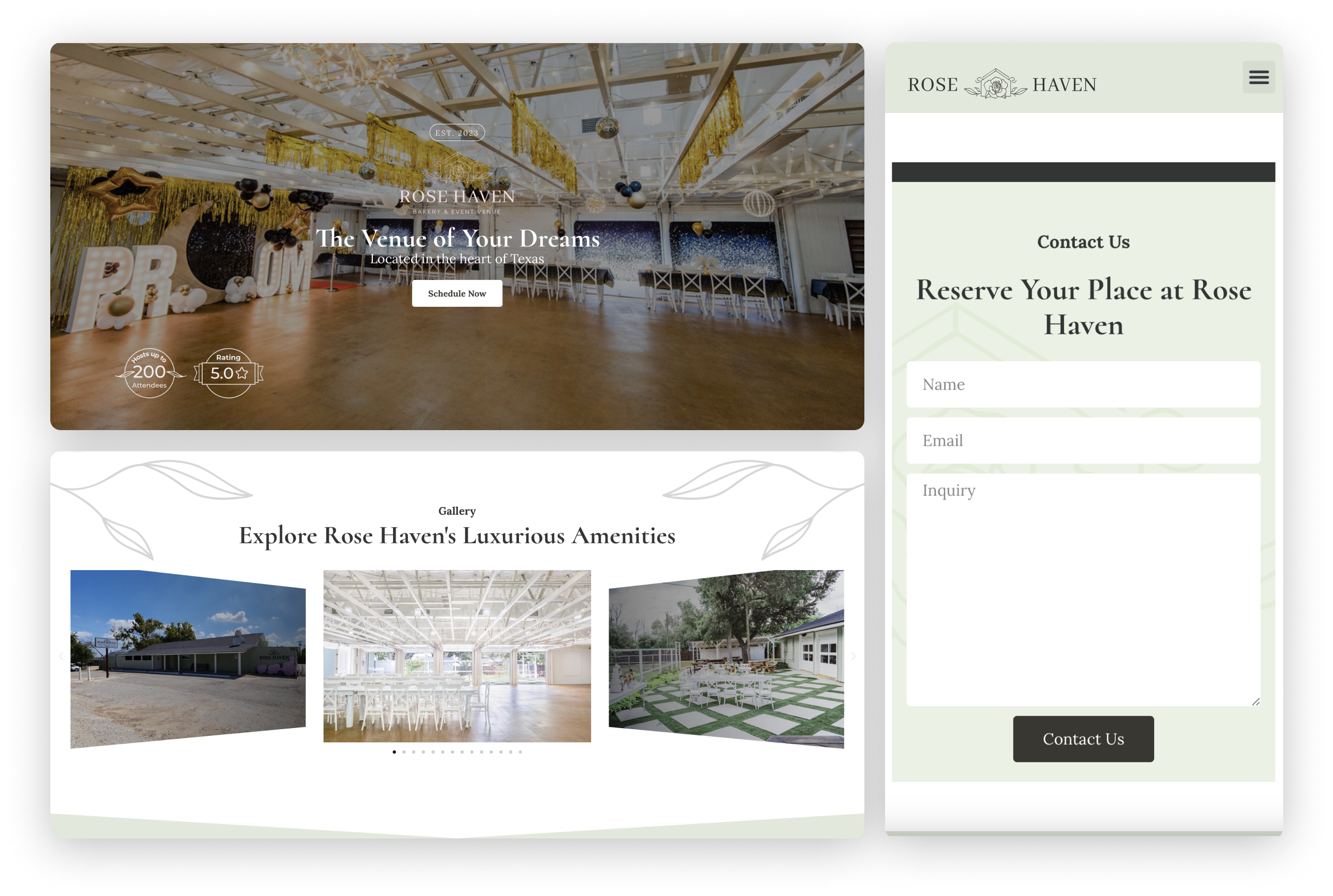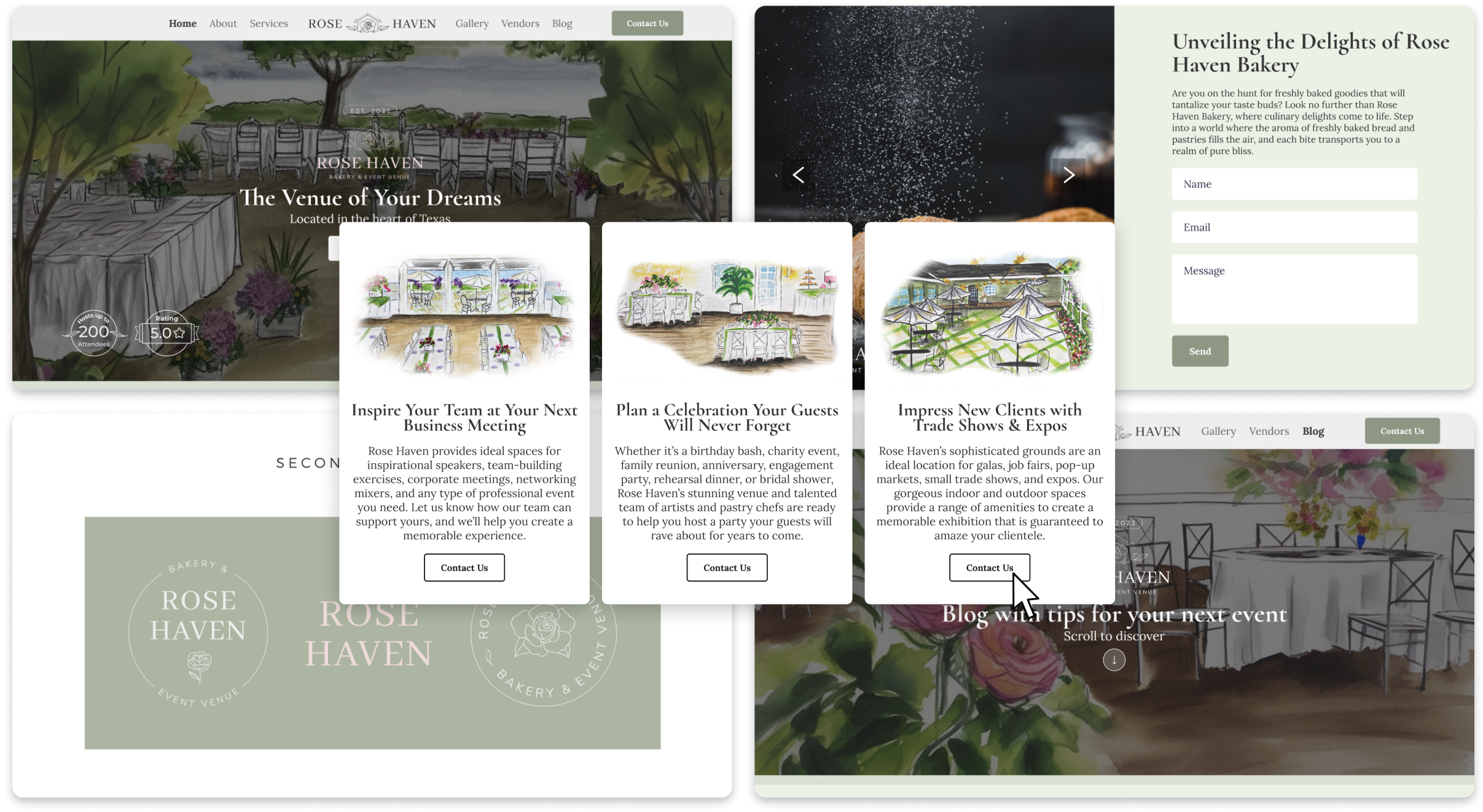 Rose Haven was destined to break the mold of the event venue market with its unique integration of an in-house bakery inside a versatile event space surrounded by antique rose gardens. When we partnered with Christy, the building was still a dingy dance hall under construction. We had the fortunate opportunity of being an integral part of Christy’s early planning phase so we could work together with her todevelop her new brand identity and services while ensuring that the presentation and tone of her website was perfectly aligned with her business as she built it from the ground up.